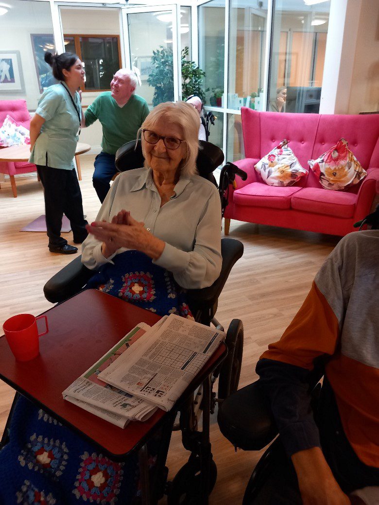 In the afternoon, we all came together to see this week’s entertainment. Natasha provided some lively music, which we sang and danced to. Her colourful outfit and careful song choice really caught our attention.